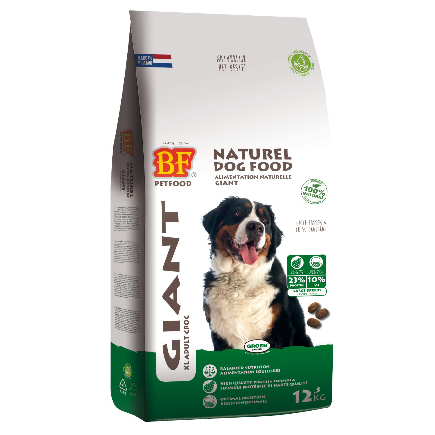 BF Petfood Giant Hundefutter ist ein Alleinfutter mit natürlichen Inhaltsstoffen für Hunde großer Rassen. Das Futter beinhaltet einen optimalen Calciumgehalt um die Knochen bestmöglich zu unterstützen und Glukosamin und Chondroitin für die Gelenkgesundheit. Die Gelenke werden nämlich bei großen Hunden besonders stark belastet. Darüber hinaus haben große Rassen eine relativ kleine Darmkapazität und eine sensible Verdauung. Das Futter ist hier drauf angepasst und sorgt dafür, dass Ihr Hund trotzdem genügend Nährstoffen erhält. Auch ist der Energiegehalt des Futters erhöht, da große Hunde mehr Energie verbrauchen. Der Brocken von BF Petfood Giant Hundefutter ist größer als bei herkömmlichen Futtermitteln - genau richtig für Ihren großen Vierbeiner!