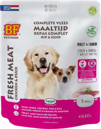 BF Petfood Frischfleisch Huhn mit Ente Hunde-Nassfutter ist ein natürliches Alleinfutter auf der Basis von frischem Fleisch (Ente, Huhn, Schaf), und frischem Fisch, sowie Organfleisch. Dieser reichhaltige Fleischmix wird durch Reis, Kräutern, Vitaminen und Mineralien ergänzt.
