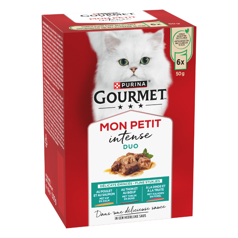 Gourmet Mon Petit Intense mit Fisch & Fleisch Nassfutter Katze bietet eine Vielzahl köstlicher Geschmacksrichtungen in einem einzigen Portionsbeutel. In jedem kleinen Beutel stecken zarte Fleisch- und Fischstücke, kombiniert in einer Sauce.