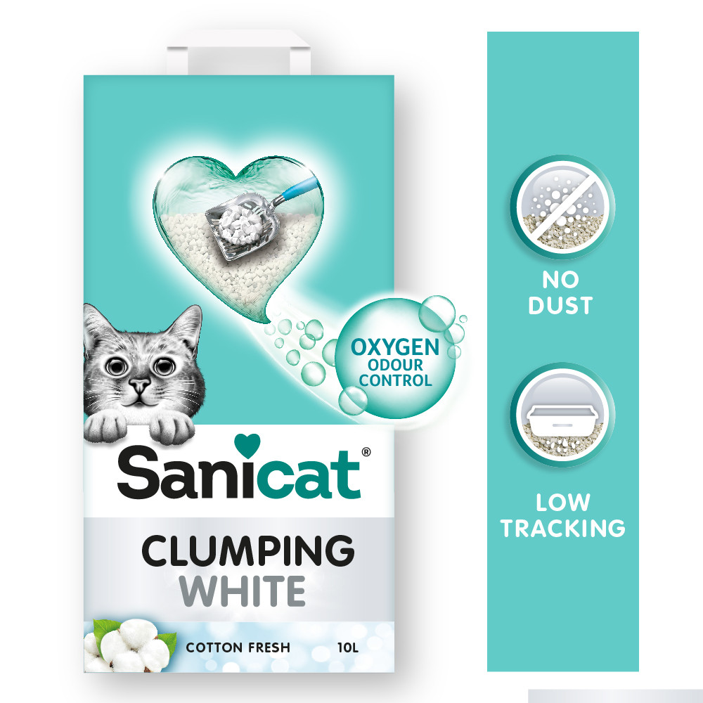 Sanicat Clumping White Cotton Fresh Katzenstreu ist ein Katzenstreu mit dem Duft frischer Baumwolle, die unangenehme Gerüche reduzieren kann.