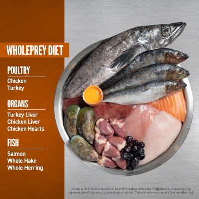 Zutaten: Frisches Huhn (18 %), roher Lachs (12 %), roher Truthahn (10 %), roher ganzer Seehecht (4 %), roher ganzer Hering (4 %), rohe Putenleber (4 %), frische Hühnerorgane (Leber, Herz) (4 %), frische Eier (4 %), getrockneter Truthahn (4 %), getrocknetes Huhn (4 %), getrockneter Hering (4 %), getrocknete Hühnerleber (4 %), getrocknetes Ei (4). %), ganze rote Linsen, ganze Pintobohnen, Hühnerfett (3 %), ganze grüne Linsen, ganze weiße Bohnen, ganze Kichererbsen, ganze Erbsen, Pollocköl (2 %), Linsenfaser, rohe neuseeländische grüne Muscheln, getrockneter Seetang , frischer ganzer Muskatkürbis, frischer ganzer Kürbis, Salz, getrocknete Zichorienwurzel, frische ganze Äpfel, frische ganze Karotten, frische ganze Zucchini, frische Rübenblätter, frischer Grünkohl, frischer Spinat, frische Rübenblätter, ganze Preiselbeeren, ganze Blaubeeren, ganzer Saskatoon Beeren, Kurkuma, Mariendistel, Klettenwurzel, Lavendel, Eibischwurzel, Hagebutten.