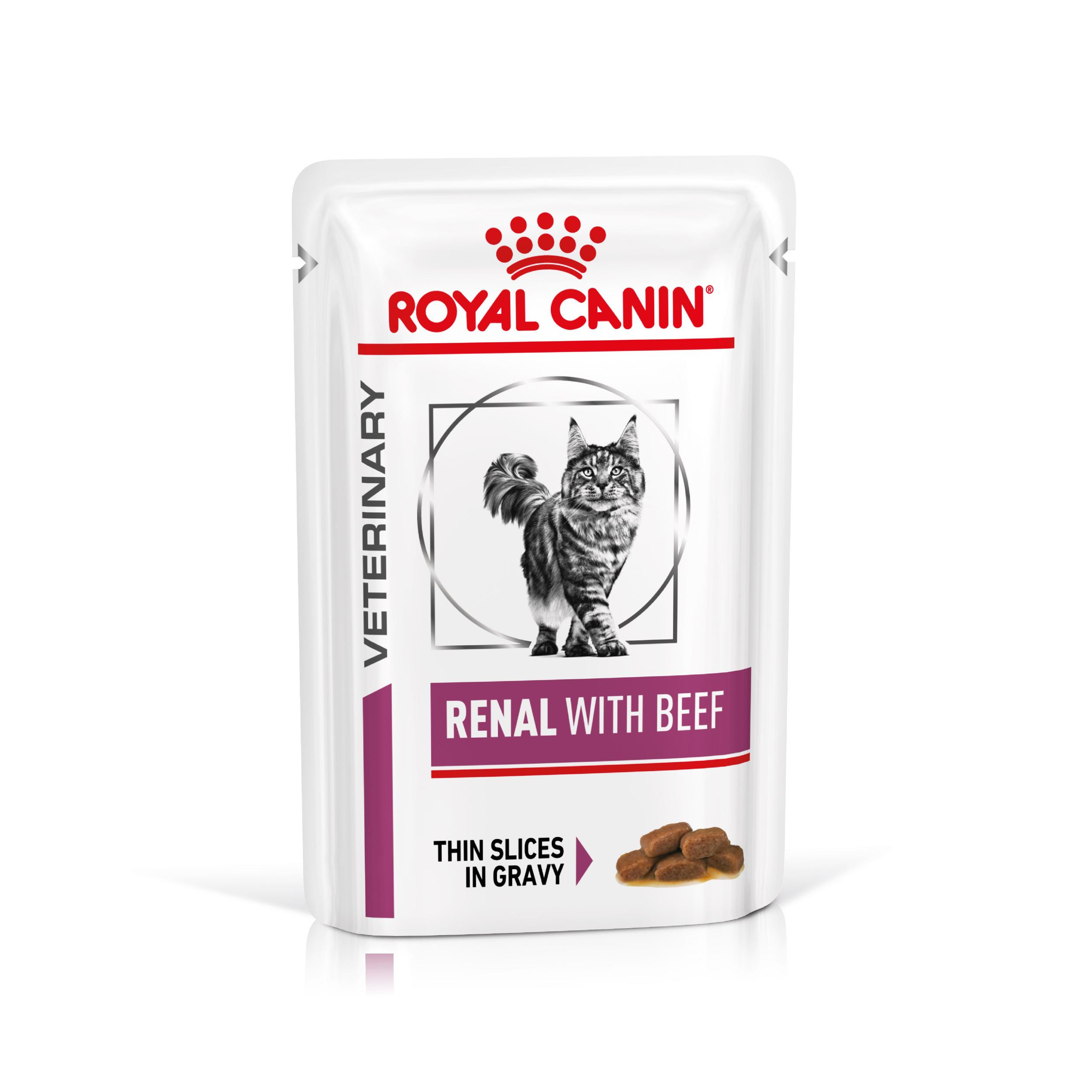 Royal Canin Veterinary Renal mit Rind Katzen-Nassfutter ist ein Komplettfutter für ausgewachsene Katzen mit chronischer Niereninsuffizienz. Verpackt in 85 Gramm Beuteln.