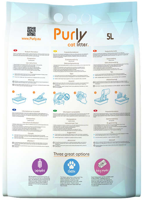 Purly Katzenstreu gibt es in zwei angenehmen Duftvarianten und einer geruchsneutralen Variante. Purly Lavendel enthält violettes Granulat mit einem leicht würzigen, frischen Lavendelduft. Purly Babypuder bietet eine Katzenstreu mit rosa Granulat, das dezent nach Talkumpuder riecht. Bevorzugen Sie eine neutrale Variante, dann ist Purly Classic die beste Wahl. Die Purly Babypuder Variante verströmt bei jedem Toilettengang Ihres Stubentigers einen frischen Duft, der unangenehme Gerüche effektiv neutralisiert. Nicht nur angenehm für Ihre Katze, sondern auch für Sie!