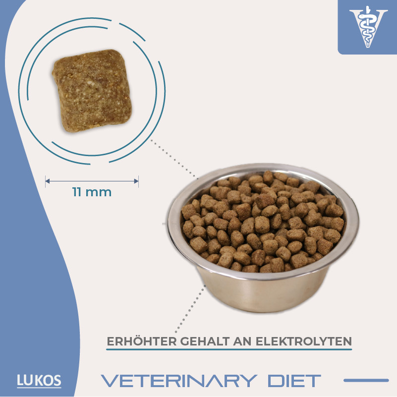 Lukos Veterinary Diet Hypoallergenes Diätfutter enthält auch einen erhöhten Elektrolytgehalt und fördert einen leicht sauren pH-Wert im Urin (Durchschnitt 6,45). Die Oberfläche der Hundebrocken enthält Zinkoxid, um Zahnsteinbildung entgegenzuwirken.